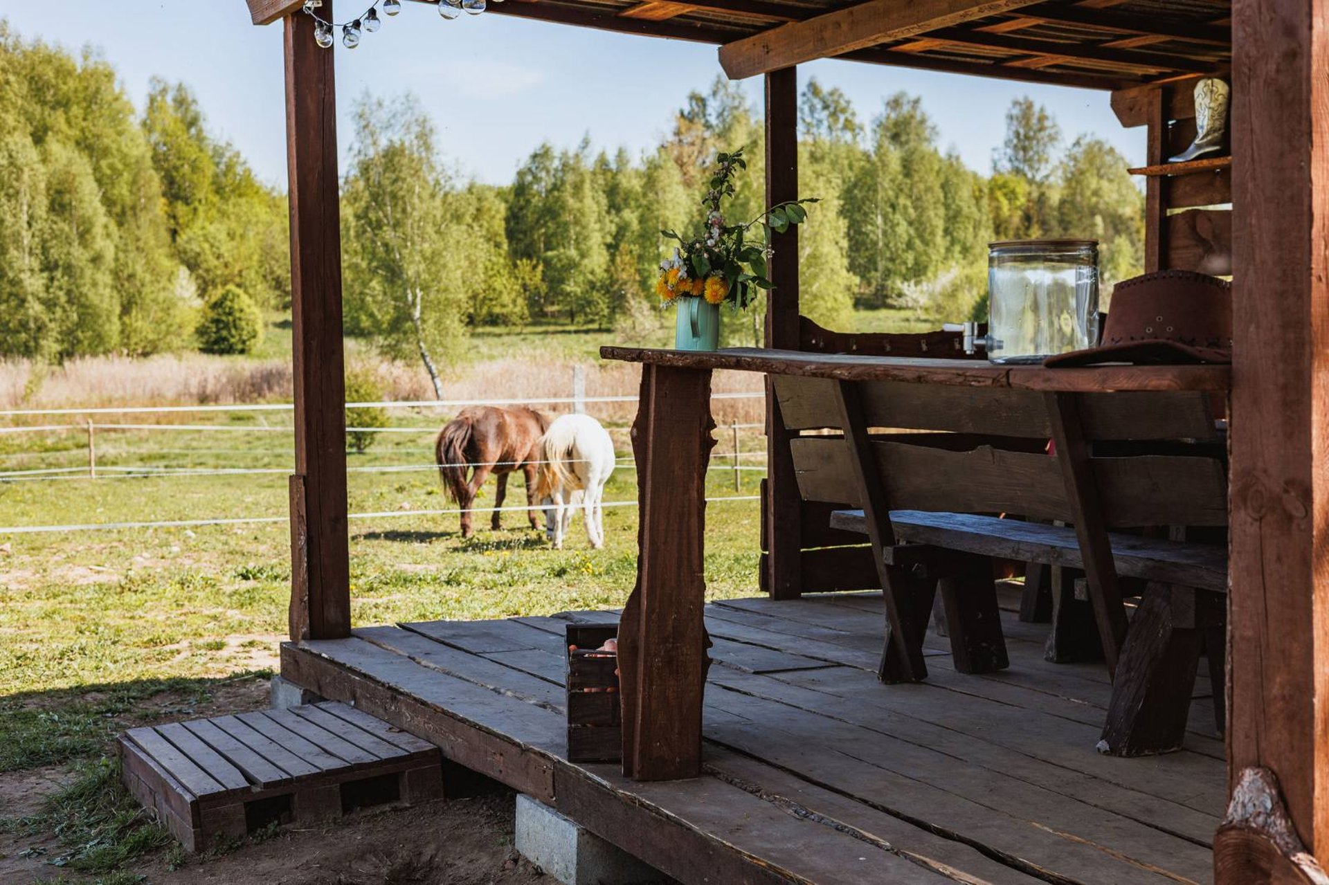Kaimiško žavesio kupinoje poilsio erdvėje Jūsų patogumui įrengta jauki pavėsine su mediniais baldais, hamakai po atviru dangumi, žaidimu erdvė miškelyje ir didelė vėja vaikų žaidimams. Aplink šią erdvę išsidėstę poniukų aptvarai, kuriuos šventės metu galėsite pavaišinti morkomis.